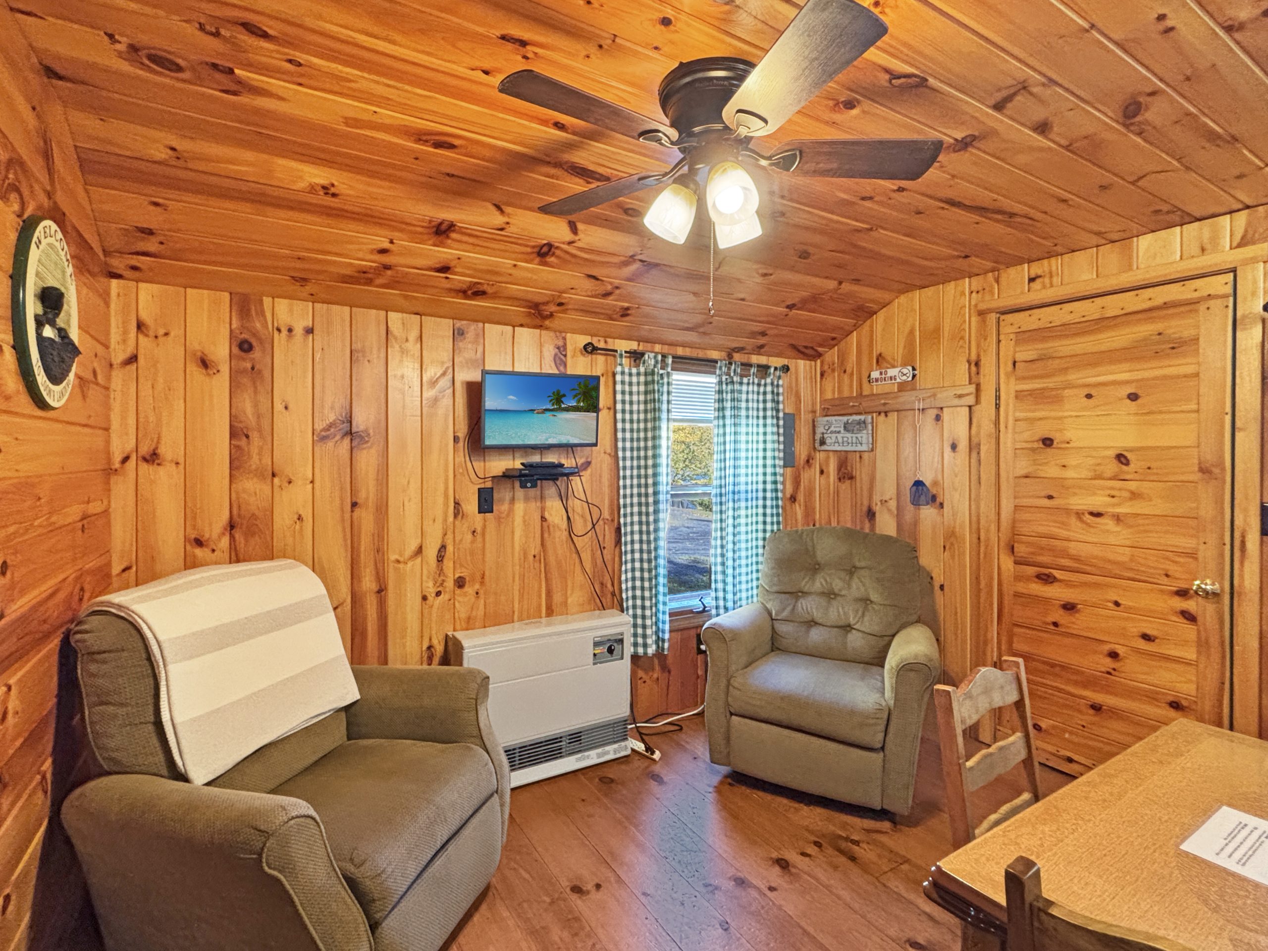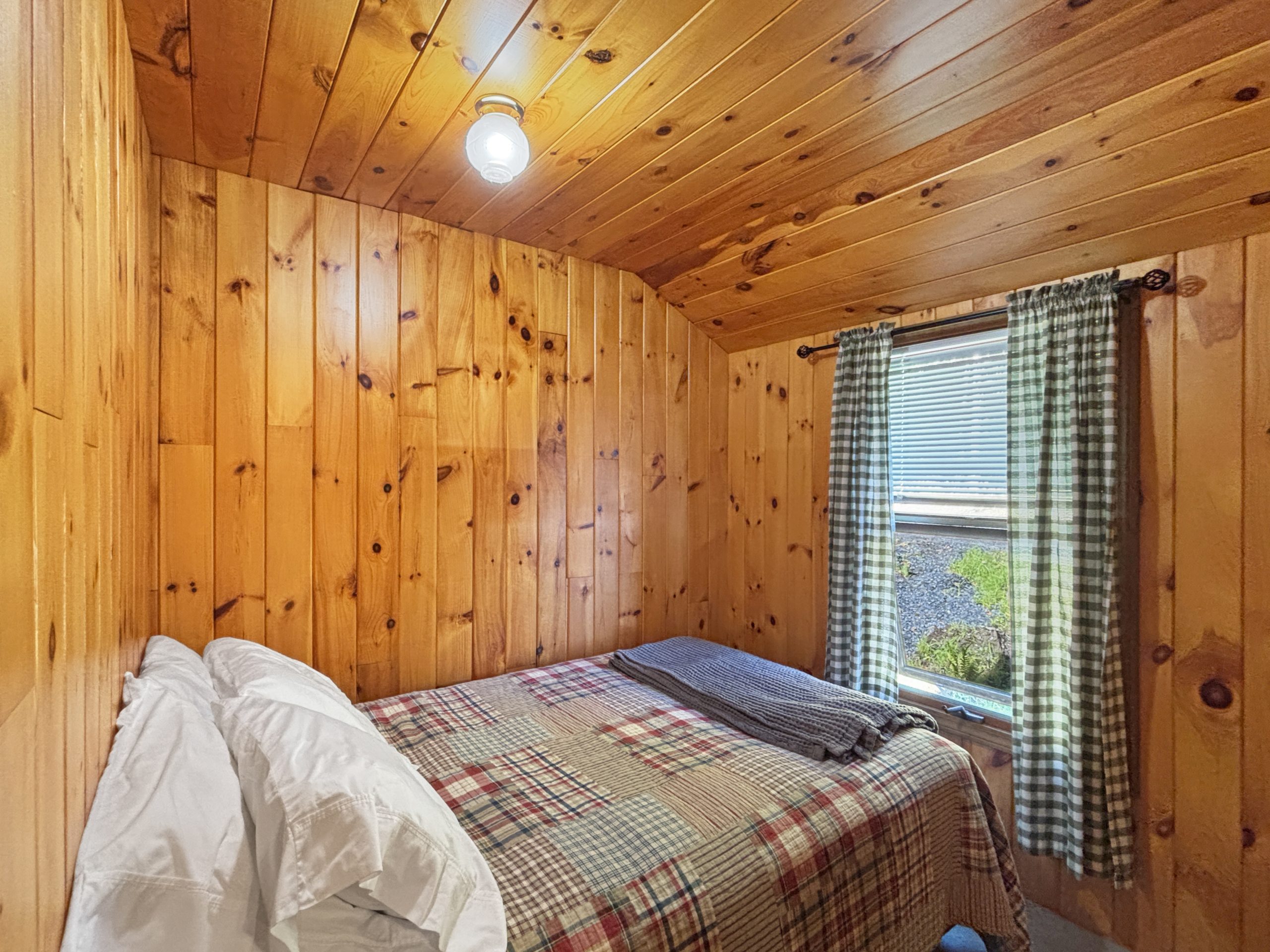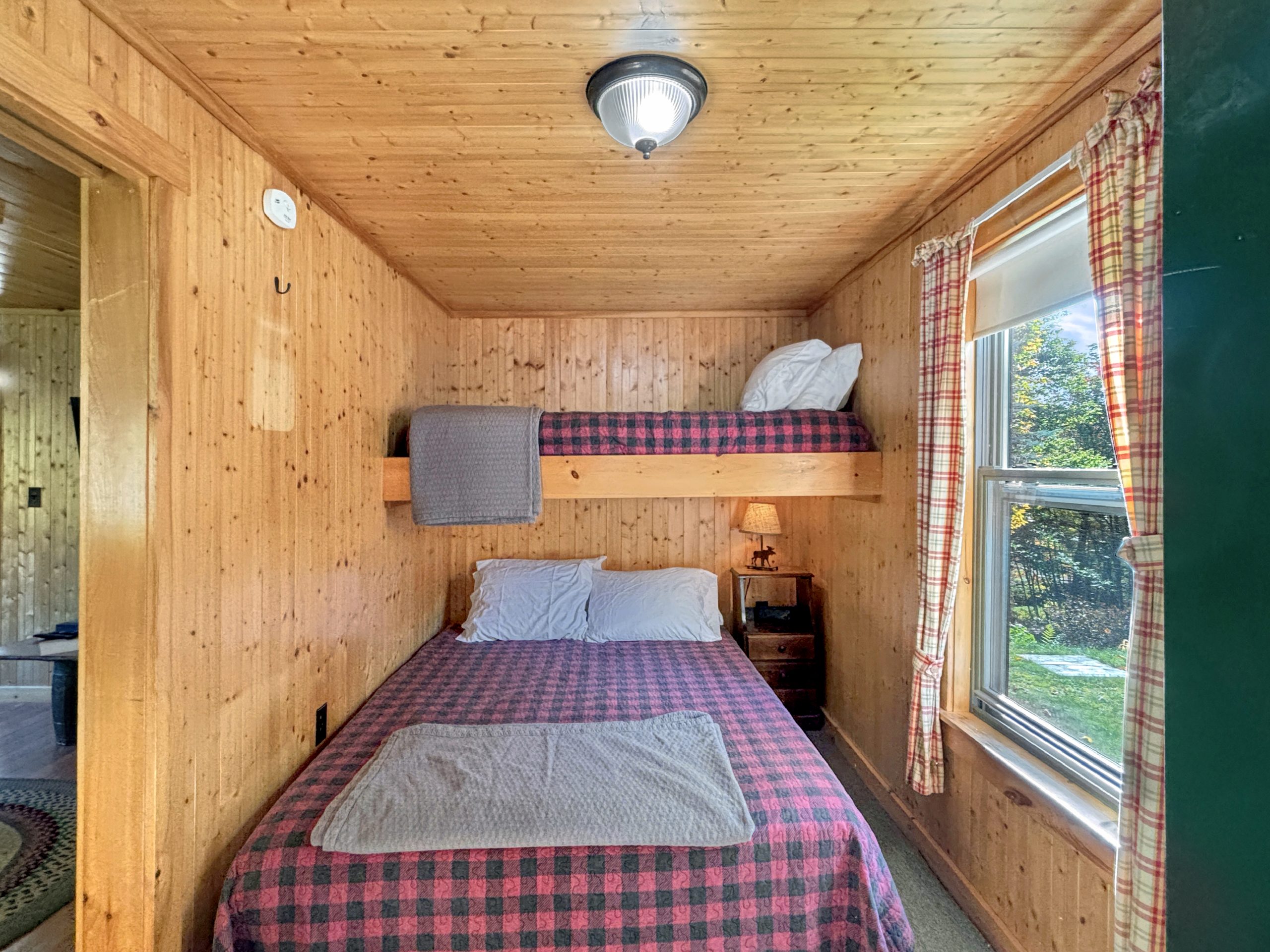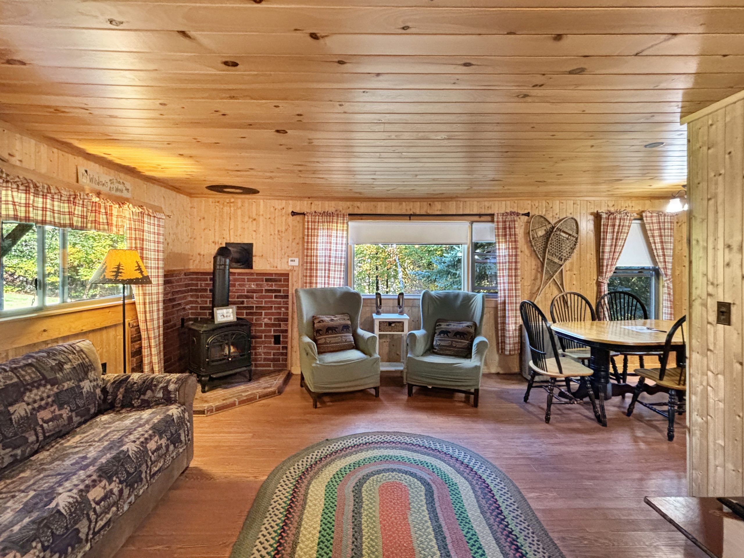 This lake view cabin is just steps from the lake and private dock. There is a screened-in porch with a porch swing to enjoy a lazy afternoon or lovely evening listening to the loons. This is our smallest cabin; the living room and kitchen are cozy. 1 bedroom has a full-size bed and Bedroom 2 has a full-size bed and a twin bed (bunk style). We supply all bedding for your comfort. WI-FI is supplied for streaming services (no local channels) and a DVD player. We offer a large library of DVDs for our guests to borrow. The kitchen is stocked with all the essentials, cookware, dinnerware, utensils, toaster, microwave, drip coffee maker (Keurig on request), paper towels, dish soap, and kitchen towels. The bathroom has a walk-in shower, and we supply 1 full set of plush towels for each guest as well as soap and blow dryer. Outside there is a firepit, gas grill, picnic table and Adirondack chairs. Our guests enjoy complimentary use of canoes, kayaks, and paddleboards on Wilson Pond.