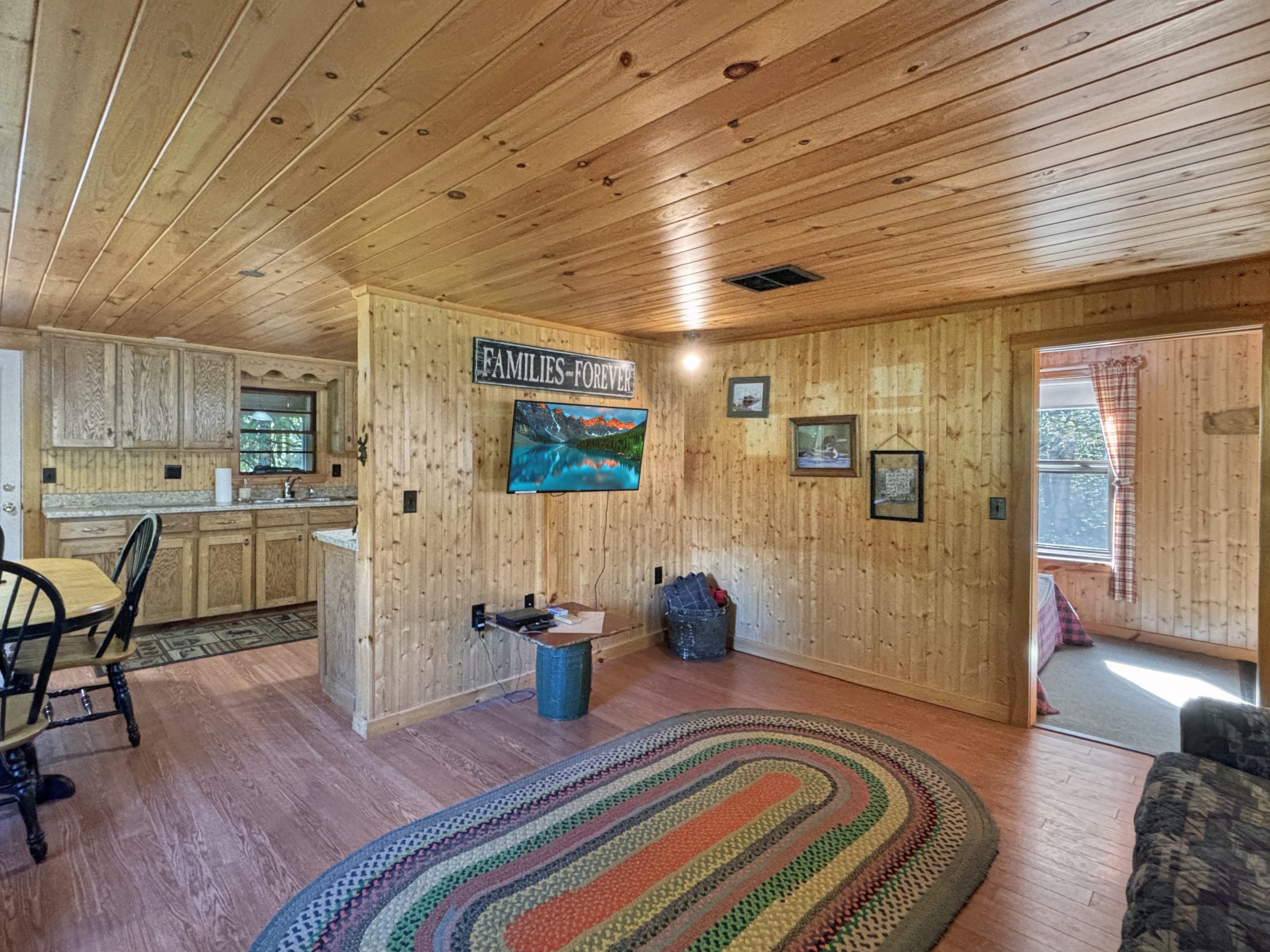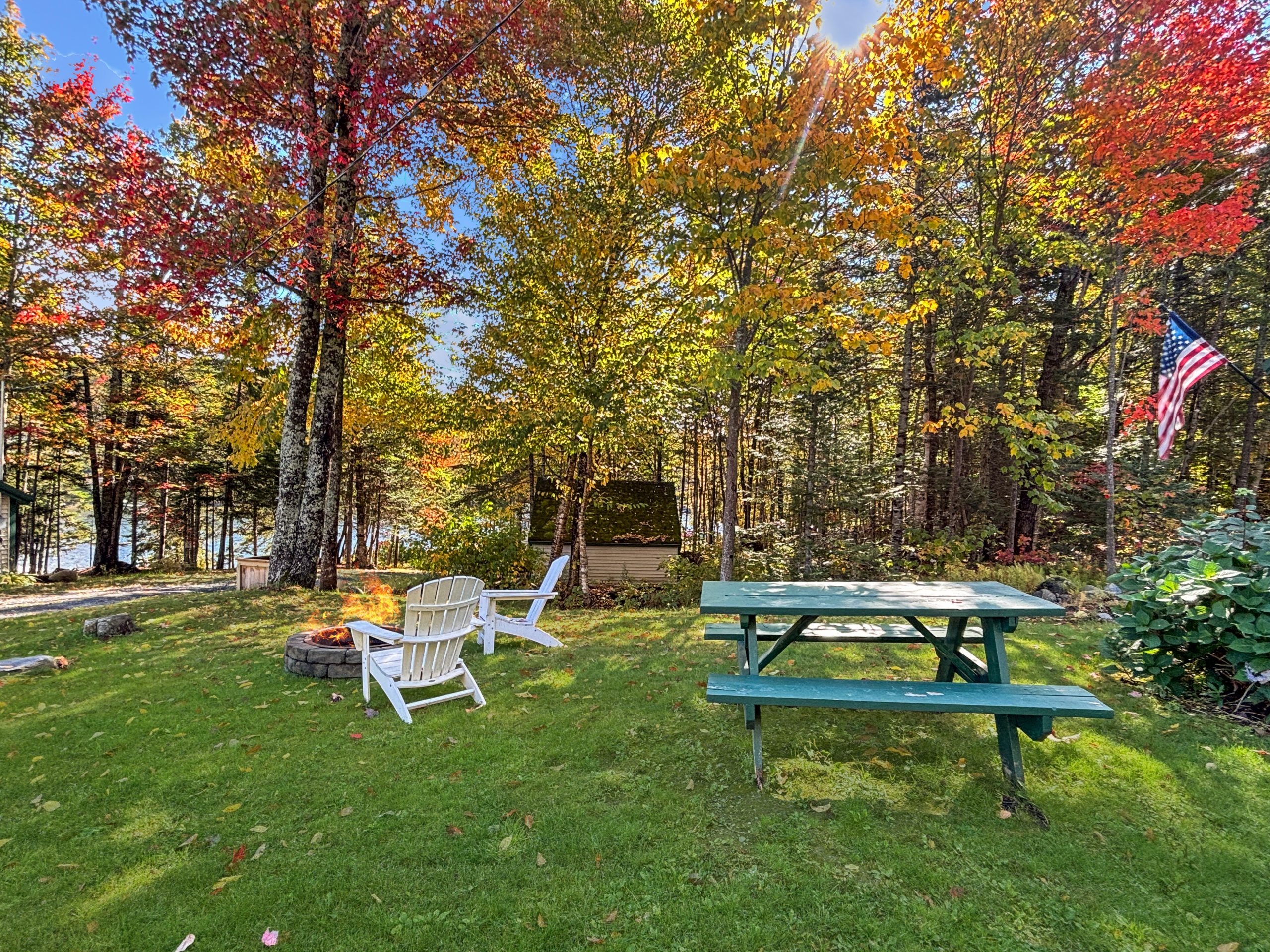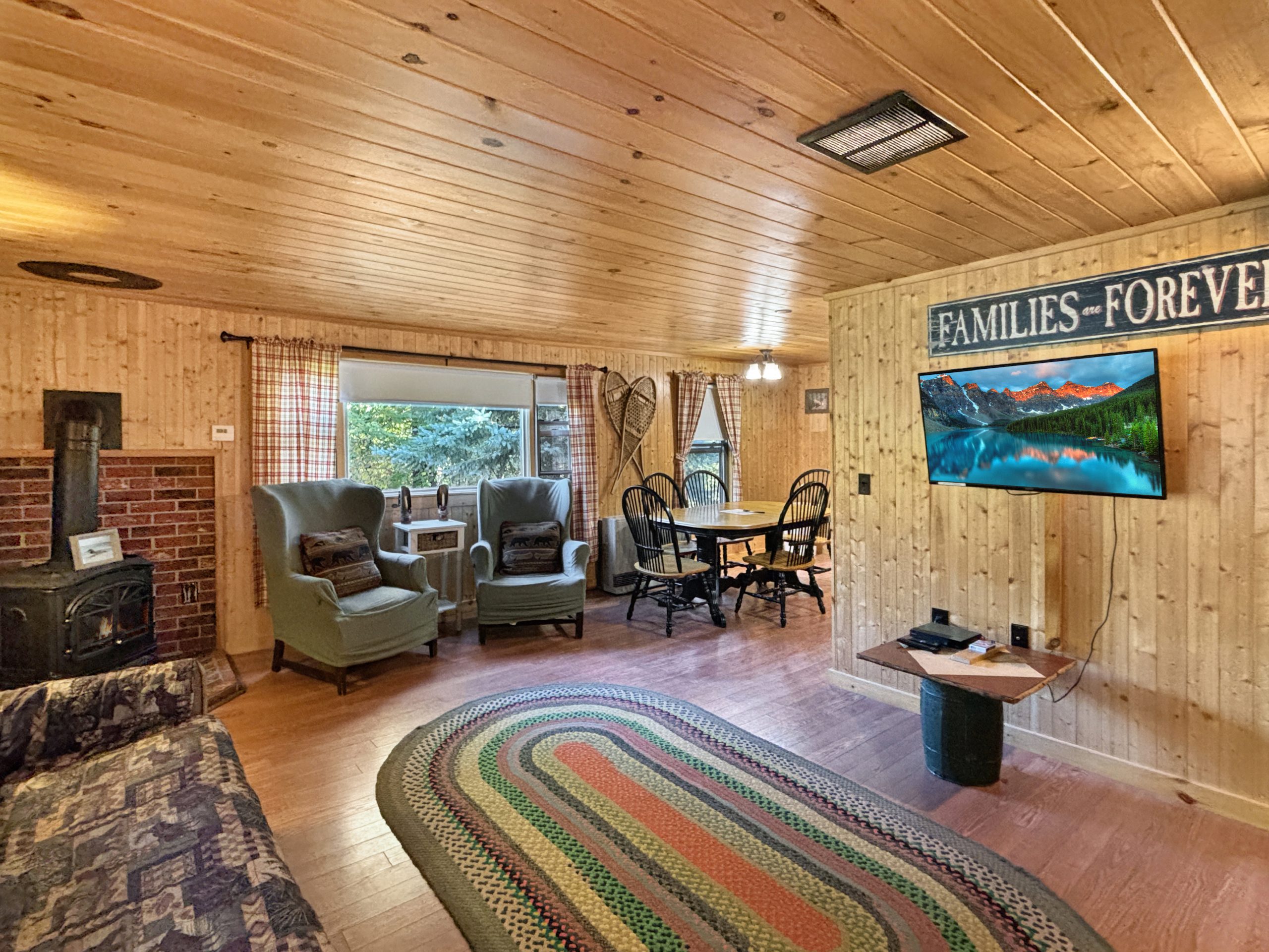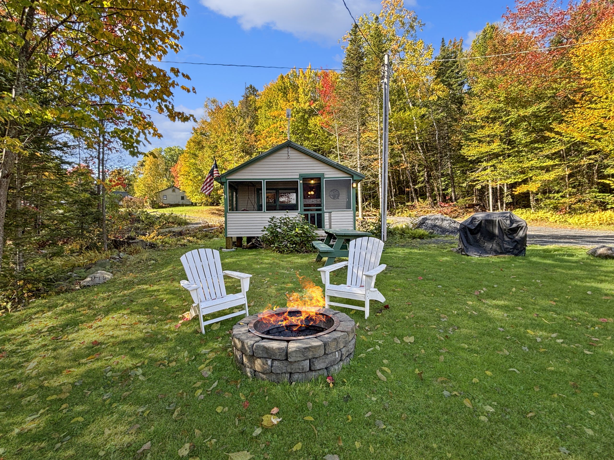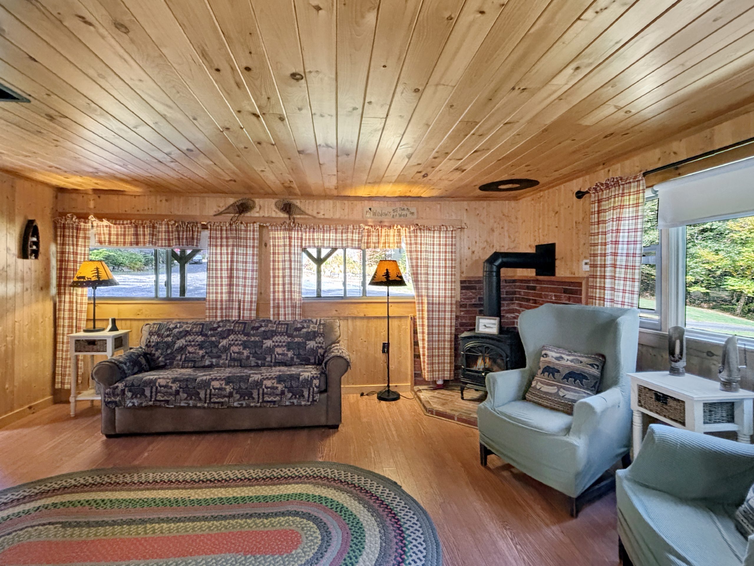 This lake view cabin is just steps from the lake and private dock. There is a screened-in porch with a porch swing to enjoy a lazy afternoon or lovely evening listening to the loons. This is our smallest cabin; the living room and kitchen are cozy. 1 bedroom has a full-size bed and Bedroom 2 has a full-size bed and a twin bed (bunk style). We supply all bedding for your comfort. WI-FI is supplied for streaming services (no local channels) and a DVD player. We offer a large library of DVDs for our guests to borrow. The kitchen is stocked with all the essentials, cookware, dinnerware, utensils, toaster, microwave, drip coffee maker (Keurig on request), paper towels, dish soap, and kitchen towels. The bathroom has a walk-in shower, and we supply 1 full set of plush towels for each guest as well as soap and blow dryer. Outside there is a firepit, gas grill, picnic table and Adirondack chairs. Our guests enjoy complimentary use of canoes, kayaks, and paddleboards on Wilson Pond.