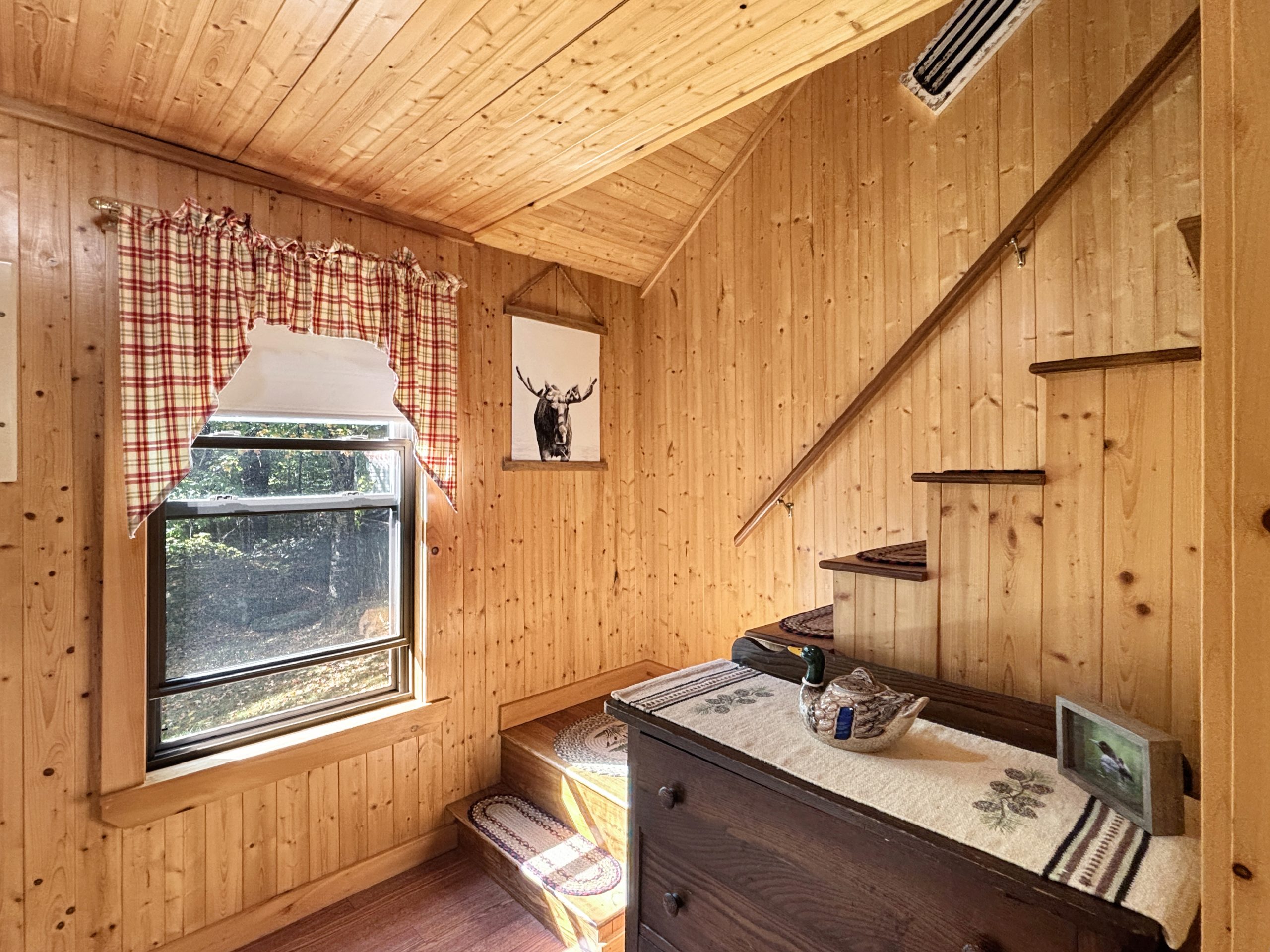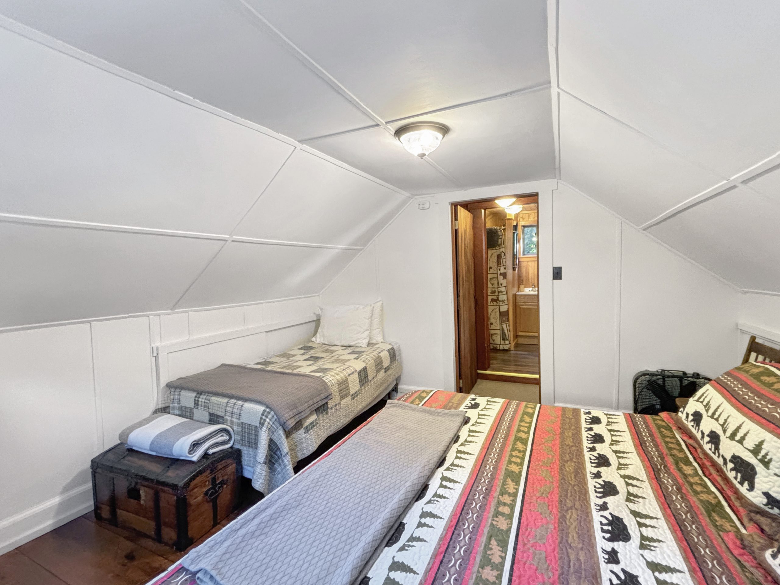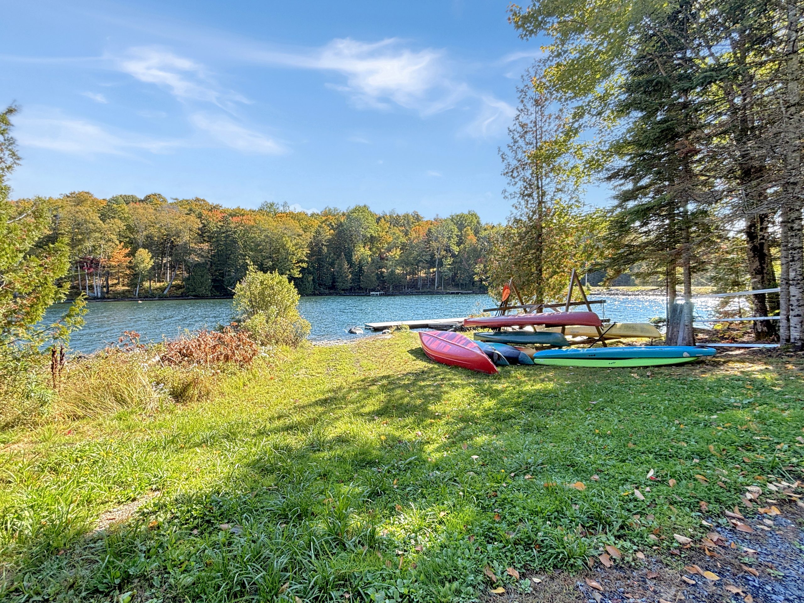 A large cabin nestled among the trees with an elevated private view of the lake. The cabin has WI-FI for streaming (no local channels) and a DVD player, and we have a large library of DVDs available for guests to borrow. It has a spacious kitchen and living room. The kitchen is fully stocked with all the essentials, Keurig and drip coffee maker, microwave, toaster, etc. We supply 1 roll of paper towels, dish soap, and kitchen towels, all utensils, dinnerware and pots and pans. Bedroom 1 has a queen-size bed and a twin-size bed (bunk style). Bedroom 2 has is on the second floor and has a king-size bed and a twin-size bed. There is room for 2 roll outs if needed for additional sleeping opportunities. All bedding is supplied for your comfort. The living room has 2 large sofas, one is a queen sleeper and the other can sleep one person very comfortably. The bathroom is on the 2nd floor and has a walk-in shower. We supply 1 full set of plush towels for each guest, bath soap, shampoo/conditioner, toilet tissue, and blow dryer. There is a large screened in the porch at the back of the cabin that is very private and great to enjoy a bug free afternoon and evening. There is a large front porch with a swing, great for relaxing. Outside there is a private area with a fire pit, gas grill, and Adirondacks to enjoy a great campfire. There is a lovely short path that takes you to the lake and dock for your enjoyment. Our guests also enjoy complimentary use of canoes, kayaks, and paddleboards on Wilson Pond.