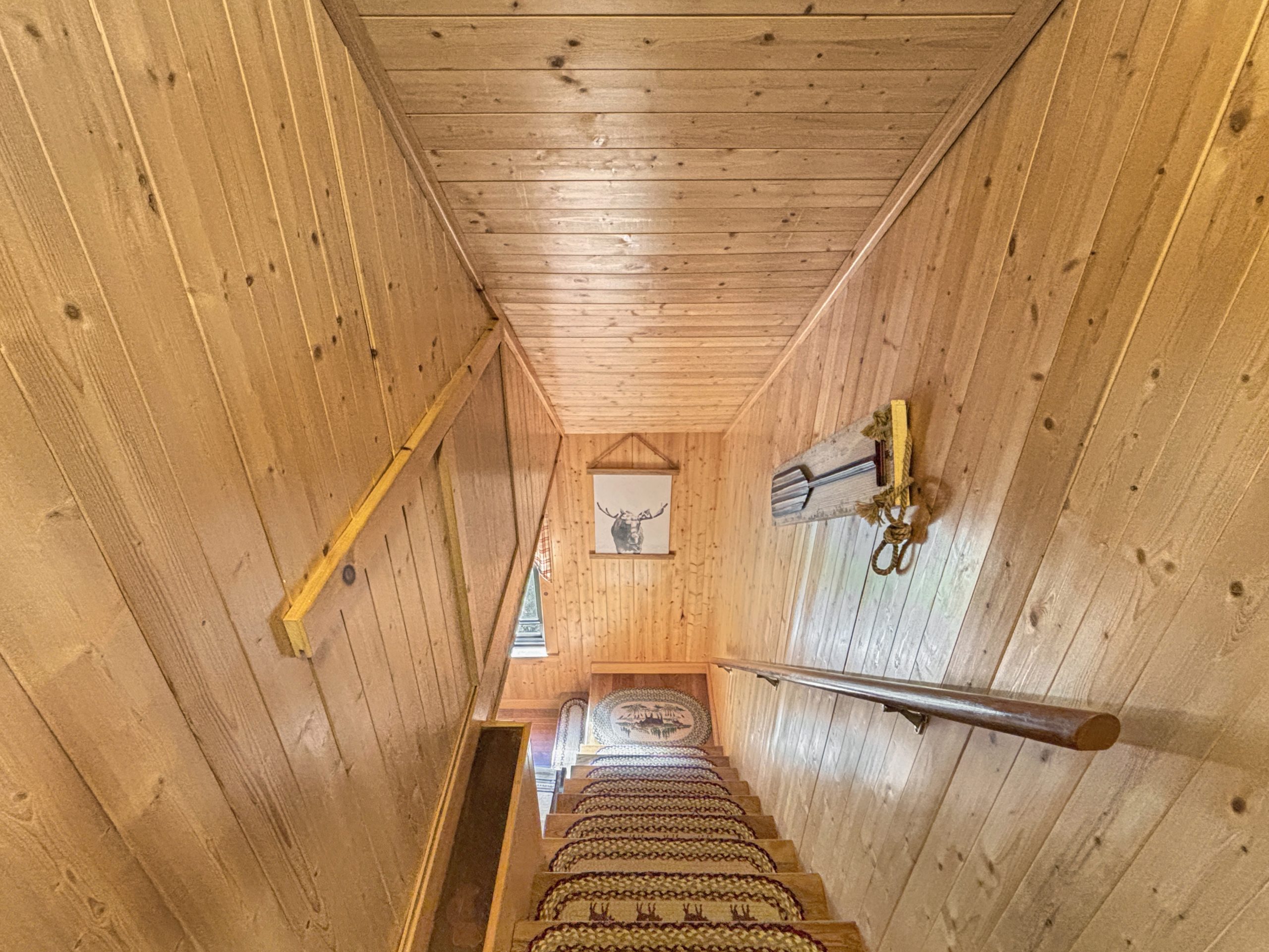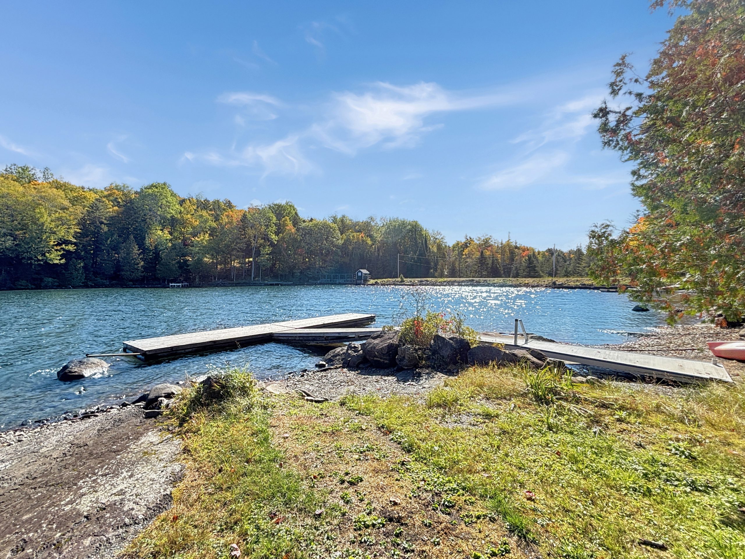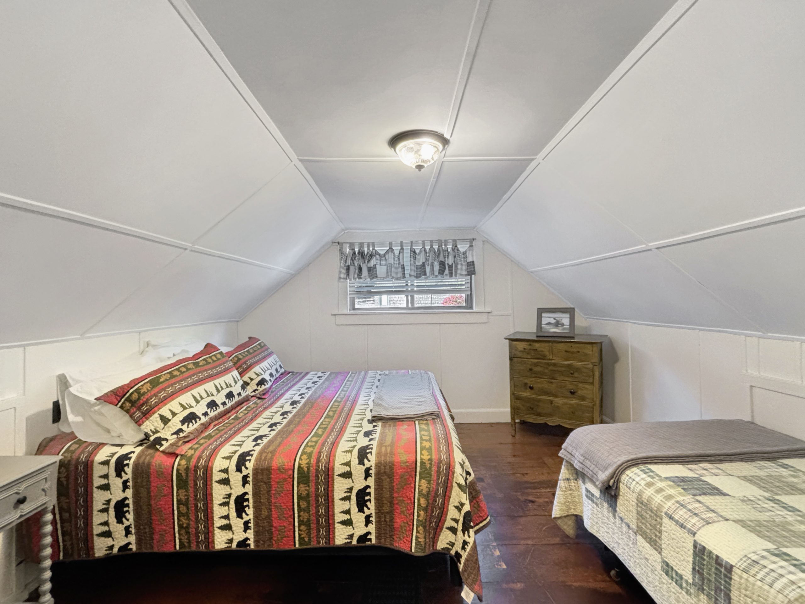 A large cabin nestled among the trees with an elevated private view of the lake. The cabin has WI-FI for streaming (no local channels) and a DVD player, and we have a large library of DVDs available for guests to borrow. It has a spacious kitchen and living room. The kitchen is fully stocked with all the essentials, Keurig and drip coffee maker, microwave, toaster, etc. We supply 1 roll of paper towels, dish soap, and kitchen towels, all utensils, dinnerware and pots and pans. Bedroom 1 has a queen-size bed and a twin-size bed (bunk style). Bedroom 2 has is on the second floor and has a king-size bed and a twin-size bed. There is room for 2 roll outs if needed for additional sleeping opportunities. All bedding is supplied for your comfort. The living room has 2 large sofas, one is a queen sleeper and the other can sleep one person very comfortably. The bathroom is on the 2nd floor and has a walk-in shower. We supply 1 full set of plush towels for each guest, bath soap, shampoo/conditioner, toilet tissue, and blow dryer. There is a large screened in the porch at the back of the cabin that is very private and great to enjoy a bug free afternoon and evening. There is a large front porch with a swing, great for relaxing. Outside there is a private area with a fire pit, gas grill, and Adirondacks to enjoy a great campfire. There is a lovely short path that takes you to the lake and dock for your enjoyment. Our guests also enjoy complimentary use of canoes, kayaks, and paddleboards on Wilson Pond.